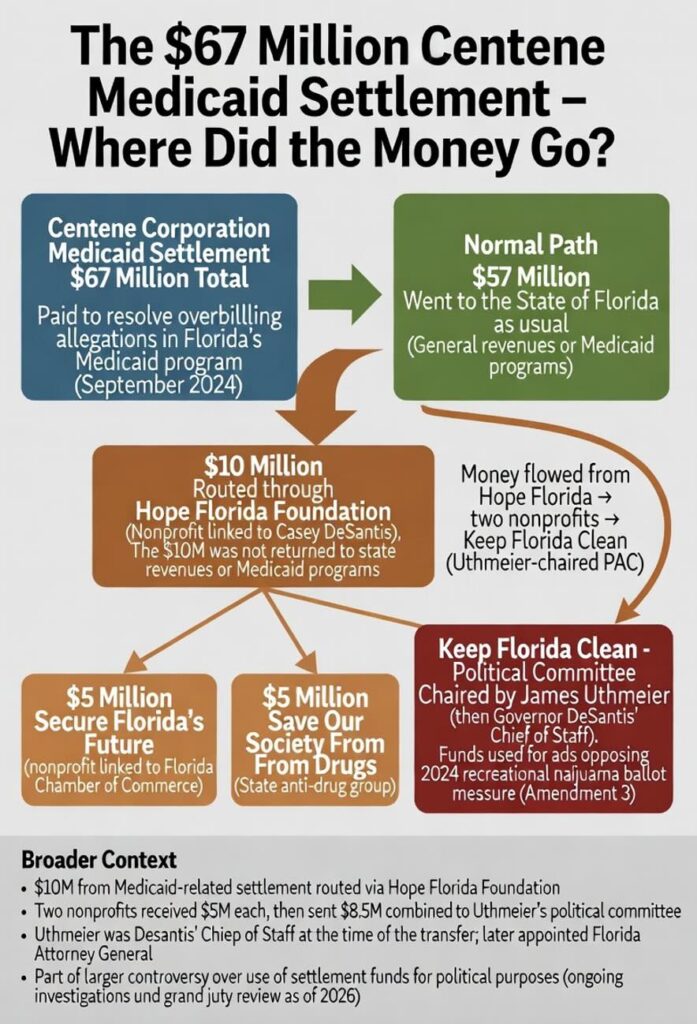 Florida state prosecutors continue to examine the diversion of $10 million out of a $67 million 2024 Medicaid settlement between Florida and contractor Centene, even as the separate federal inquiry was quietly dismissed without charges earlier this year. That amount was diverted to the Hope Florida Foundation, a nonprofit closely tied to First Lady Casey DeSantis. The Medicare funds were earmarked for the poor, the elderly, and the handicapped.